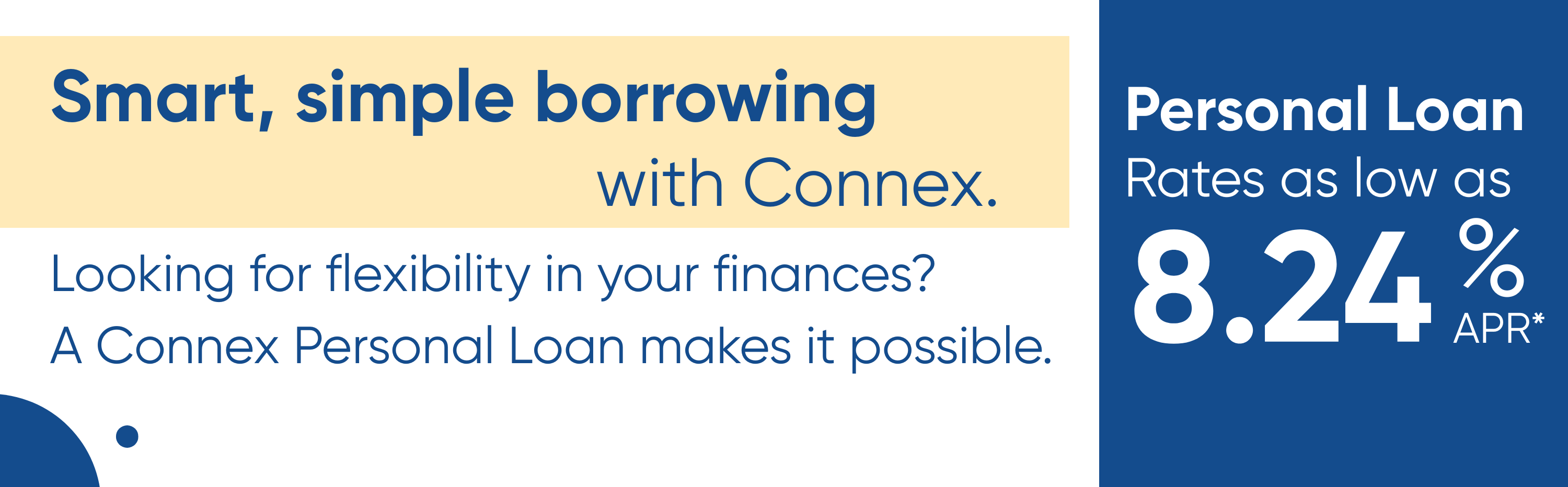 1 APR = Annual Percentage Rate. A 8.24% APR is representative of a 36-month Personal Loan and the monthly payment would be $31.46 for each $1,000 borrowed. Annual Percentage Rate includes a 0.25% rate discount with AutoPay from a Connex Credit Union checking account. Other rates and terms are available upon approved credit. Programs, rates, terms, and conditions are subject to change at any time and may be withdrawn without notice. The rate you pay will be determined by the term of the loan, your credit history, and other factors. All loans are subject to credit approval, underwriting guidelines, and membership eligibility. Other terms and conditions may apply. The minimum loan amount is $1,000 and the maximum loan amount is $20,000. Refinancing existing Connex loans is not eligible. Offer effective January 1, 2025, through March 15, 2025.