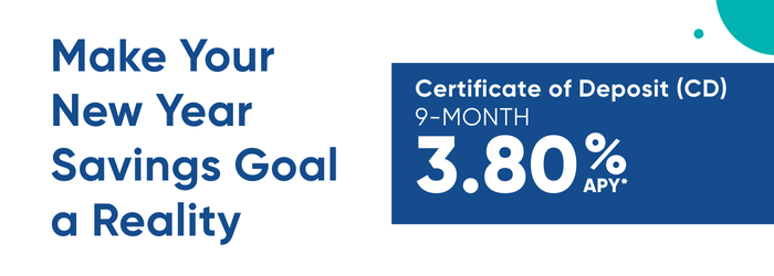 New year, new financial goals. Our 9-Month Certificate helps you put extra cash to work while keeping your savings on track. It’s an easy way to grow short-term savings while earning 3.80% APY*. Bring in new funds today, lock in this limited-time rate, and watch your savings grow.